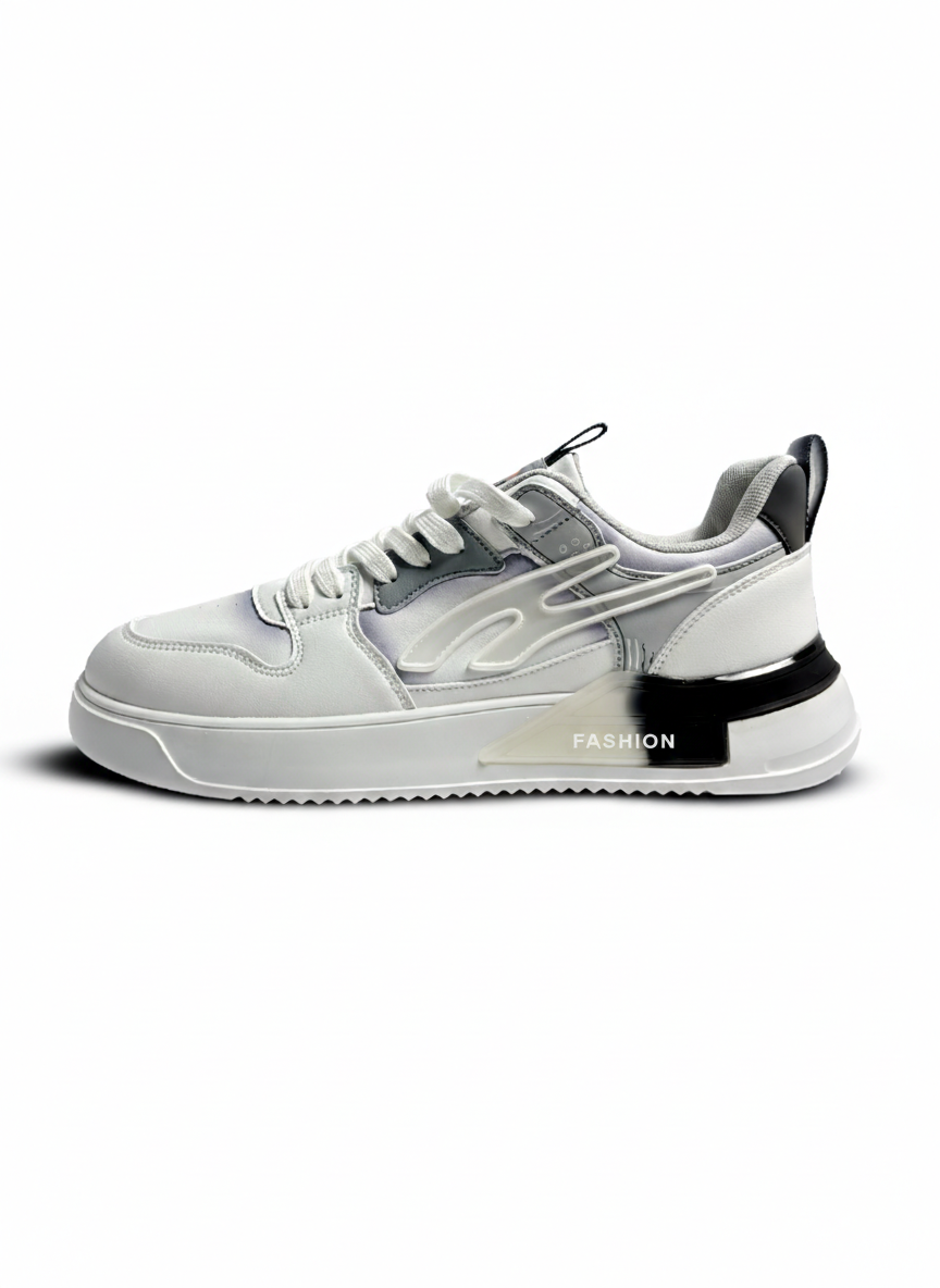 Step up your style game with these modern, chunky-sole sneakers. Designed for both comfort and a high-fashion aesthetic, these trainers feature a clean white and grey color palette with a unique translucent “FASHION” heel insert.